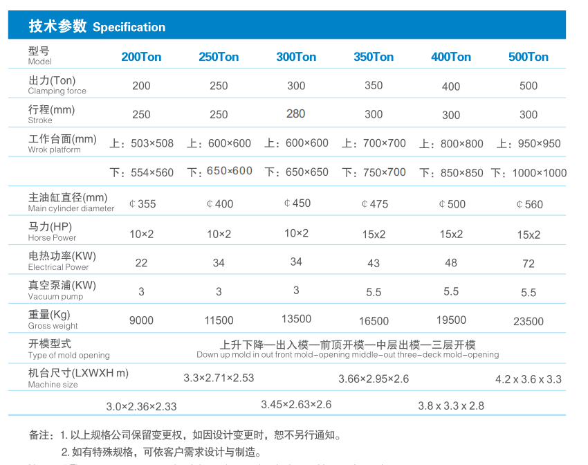 菜單產品中心Product center 全自動真空硫化機 全自動平板硫化機 全自動硅橡膠硫化機 高精密度全自動真空成型機 高精密度全自動油壓成型機 高精密度全自動射出成型機 特殊定制機型 周邊輔助設備 IMD氣體高壓成型機 熱門產品 →先進先出立式橡膠射出硫化機 KSU200-1500(Tons)→臥式橡膠射出硫化機 KSA200-2000(Tons)→先進先出臥式硅膠射出硫化機 KSB 200-500(Tons) 返回您的位置:首頁 → 產品中心 → 全自動真空硫化機 高精密度雙油泵全自動快速真空前頂3RT開模油壓硫化機類別:全自動真空硫化機 簡介:采用雙動力個別油路設計、穩定、安靜、故障率低、兩軸可同時操作,并可節能50%; 在線咨詢 返回列表 產品說明 機臺特點· 采用雙動力個別油路設計、穩定、安靜、故障率低、兩軸可同時操作,并可節能50%;· 前頂開模之適合各種二層或多層模具使用,是一種新型多功能機型;· 掀合模速度可調,準確可靠;· 進出模定位準確,100%的定位安全,并確保模具不損壞;· 真空室內可在5秒內達到650-700mmHg;· 具有快,慢速校模選擇功能,使模具正常校正更精準,更安全。 技術參數 適用產品 汽車配件、橡膠迫緊、醫用橡膠、O型環、性用品、硅膠按鍵、民用橡膠、工業橡膠、瓶塞、硅/橡膠類等多層模壓制品。 相關產品 高精密雙油泵全自動快速真空軌道開模油壓硫化機 高精密度雙油泵全自動快速真空前頂2RT開模油壓硫化機 高精密度雙油泵全自動快速真空前頂3RT開模油壓硫化機 高精密度雙油泵全自動快速真空前頂4RT開模油壓硫化機